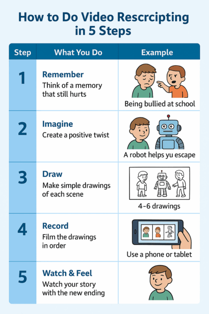 Video Rescripting is a variation on Imaginary Rescripting, as used in schema therapy and EMDR. It works like this: You conjure up an image of a loaded memory or event. Then you conjure up one or more positive images.